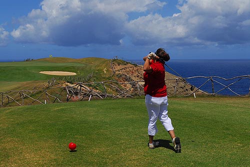 Porto Santo Golf Course is ontworpen door Severiano Ballesteros en is een par 72 en is voor de heren vanaf de gele tee 5.984 meter en voor de dames vanaf de rode tee 5.357 meter. De baan is fantastisch ontworpen en met name de holes langs de kliffen zijn zeer spectaculair en mooi geïntegreerd in het landschap, geen holes waarvan je denkt “hier klopt iets niet”. Voor het spektakel gaan we naar de holes 14, 15 en 16 die langs de kliffen lopen en waar we fantastische uitzichten hebben op het kolkend water van de Atlantische Oceaan, 80 meter lager dus! Hole 14 is zonder twijfel één van de holes die grote indruk zal achterlaten. Het is een par 4 dogleg naar rechts om een klif heen. Afsnijden over de klif is mogelijk, dan is het van tee tot green 291 meter waarbij de green een aantal meters lager dan de tee ligt. Misschien met wind mee? In ieder geval, deze hole heet dus “Seve’s Trick” omdat het Seve Balllesteros bij de opening gelukt is zijn bal vanaf de champions tee met zijn afslag op de green te leggen, chapeau! Longhitters kunnen op een aantal holes een slag winnen zonder overdreven risico’s te hoeven nemen. Dat de baan aan de hoogste kwaliteitseisen voldoet blijkt wel uit het feit dat het Madeira Open hier in 2009 en 2010 is gespeeld.