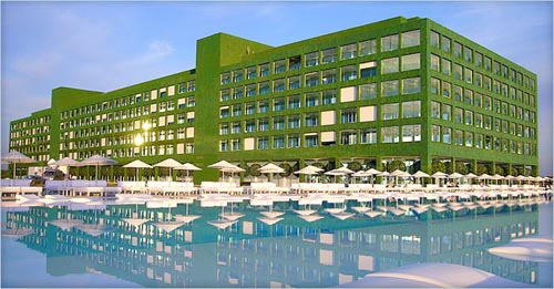 Adam & Eve Hotels in Belek is niet bepaald een doorsnee hotel, zo is de buitenkant van het hotel bekleed met groen kunstgrastapijt, staan overal in en rond het hotel kunstbomen met rode vierkante appeltjes, en wordt je welkom geheten door een team van adembenemend mooie in wit geklede Angels van veertien verschillende nationaliteiten. Uiteraard is de groene kunstgrasbekleding een subtiele verwijzing naar de groene Hof van Eden en staan de vierkante rode appeltjes synoniem voor de verleidelijke vrucht waar Eva geen weerstand aan kon bieden. En de in het wit geklede Angels? Dat zijn gewoon goed opgeleide gastvrouwen die meerdere talen spreken en daarnaast prettig zijn om naar te kijken, ze doen geen pijn aan de ogen!