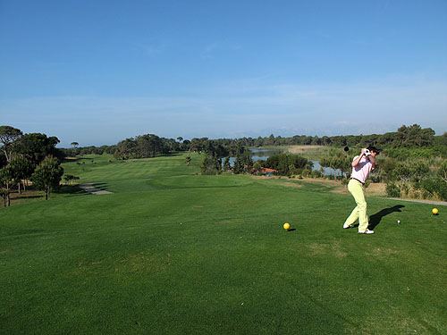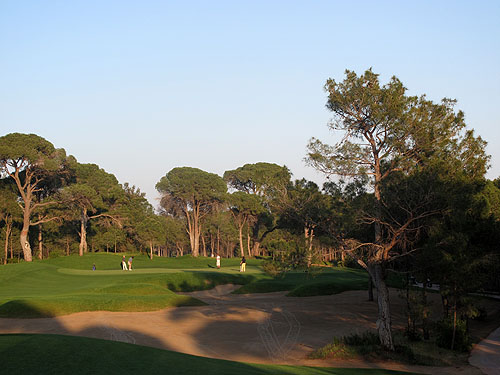 Golfen kan in Belek uiteraard ook. Direct bij de oprit van het hotel is ook de ingang van de Montgomerie golfbaan, één van de jongste banen in de omgeving. Deze in eind 2007 geopende par-72 baan is voor de heren 5.793 meter lang en voor de dames 4.914 meter. De baan heeft een dubbel karakter, deels kan de baan gekwalificeerd worden als een inland seaside course en deels als een park/bosbaan. Vooral het park/bosbaan gedeelte ziet er volwassen en veel ouder uit dan hij in feite is. Je hebt in ieder geval niet het idee dat de baan eigenlijk pas een paar jaar oud is, heel knap gedaan. De kwaliteit is, zoals van een Montgomerie design verwacht mag worden, uitstekend. Mooie dichte, verende fairways als het spreekwoordelijke tapijt waar de ballen mooi boven op liggen en goede greens die, wanneer kort gemaaid en gewalst, zeer snel en moeilijk gemaakt kunnen worden. Voor de gemiddelde recreatie golfer volstaat de gemiddelde snelheid van 9 à 9,5 op de stimp meter meer dan voldoende. In het algemeen gaat het hier om een moderne baan met een duidelijk “resort karakter”. De bal kan in de meeste gevallen makkelijk terug gevonden worden en is dan meestal ook nog redelijk speelbaar. Juist daardoor is de baan aanterekklijk voor spelers van elk niveau. De lagere handicapper kan aan vallend spelen en de hogere handicapper zal niet al te snel in serieuze problemen komen.