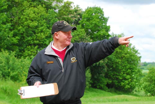 Op naar de tee van de eerste hole. Hier worden we opgewacht door Alan Highgate, de headpro van de club die ons zal starten. Als ik hem stiekem van opzij bekijk bedenk ik dat hij mij wel erg bekend voorkomt, en opeens weet ik het, hij lijkt op Jack Nicklaus! De gelijkenis is werkelijk treffend. Blijkbaar ben ik niet de eerste die dat vindt want hij grapt direct dat hij zich af en toe anoniem onder de mensen begeeft, goed gevoel voor humor die Engelsen!