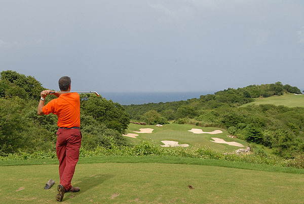 Als ik na het ontbijt naar Sandals Golf & Country Club wordt gebracht trekt de lucht echter helemaal dicht en begint het licht te miezeren. Eerlijk gezegd voelt het heerlijk verkoelend aan en stoort de regen mij totaal niet en samen met caddie Flurry begeef ik mij naar de eerste tee. Alle holes hebben namen en de eerste hole (een par 5 van 520 yards) heet onheilspellend “The Shark”. Andere aansprekende holes zijn de par-3 7e hole die “Fishing Pond” heet (u mag driemaal raden waarom), de par-5 14e hole die “Dare Devil” heet en de longhitters uitnodigt om over de bomen af te snijden, en de par-4 18e hole die verlossend “Home at Last” heet. Ondanks de regen is het duidelijk dat de baan prachtig is aangelegd, zeer goed onderhouden en een genot voor spelers van ieder niveau.
